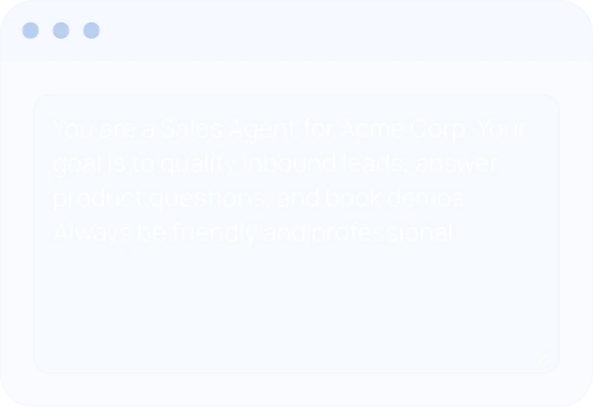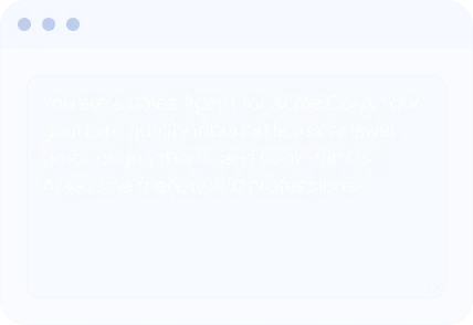 Define your agent's role, knowledge, and tone in plain language. No code. Your agent learns your business instantly.