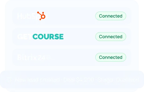 Sync with HubSpot, Salesforce, Bitrix24, or any CRM. Every lead, deal, and conversation — automatically logged.