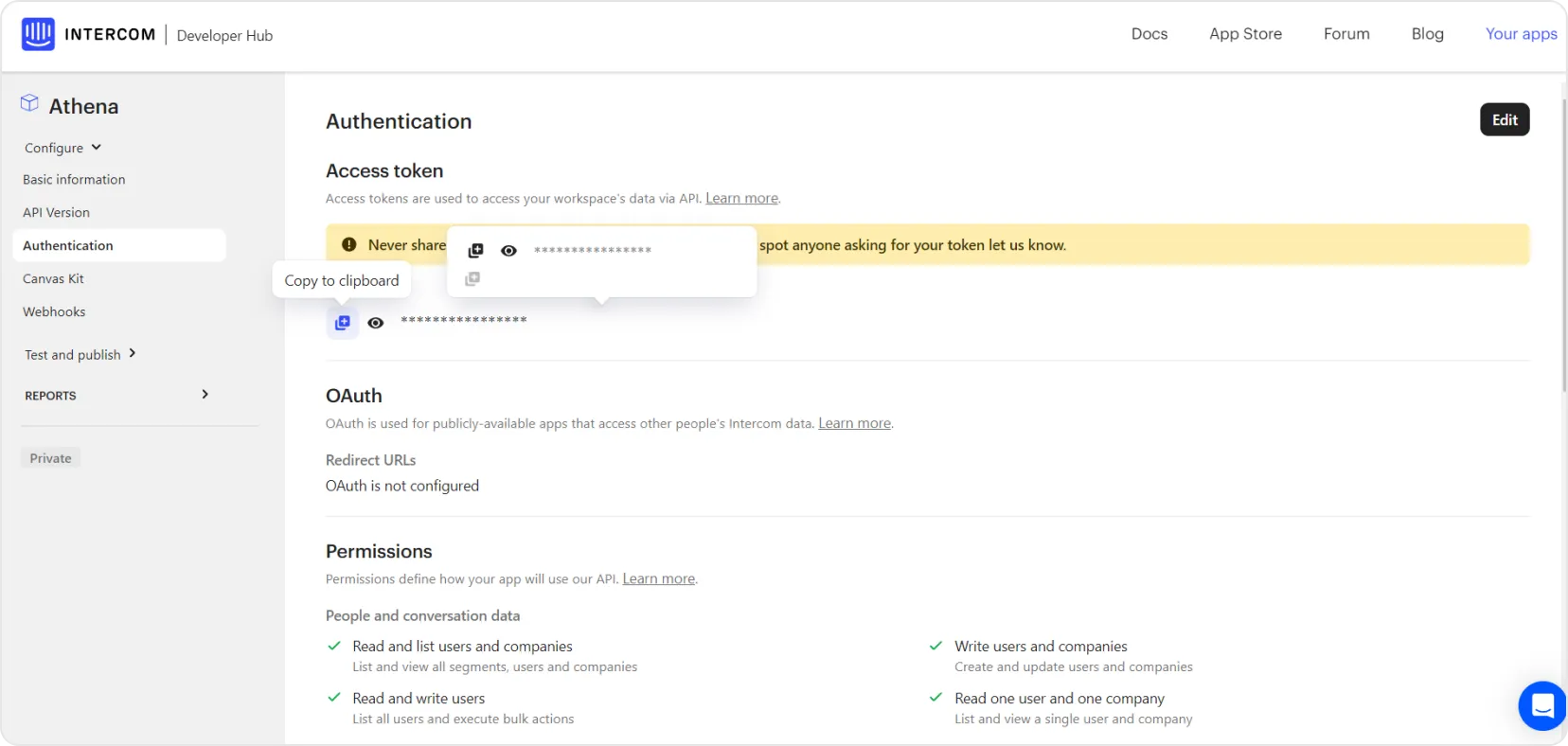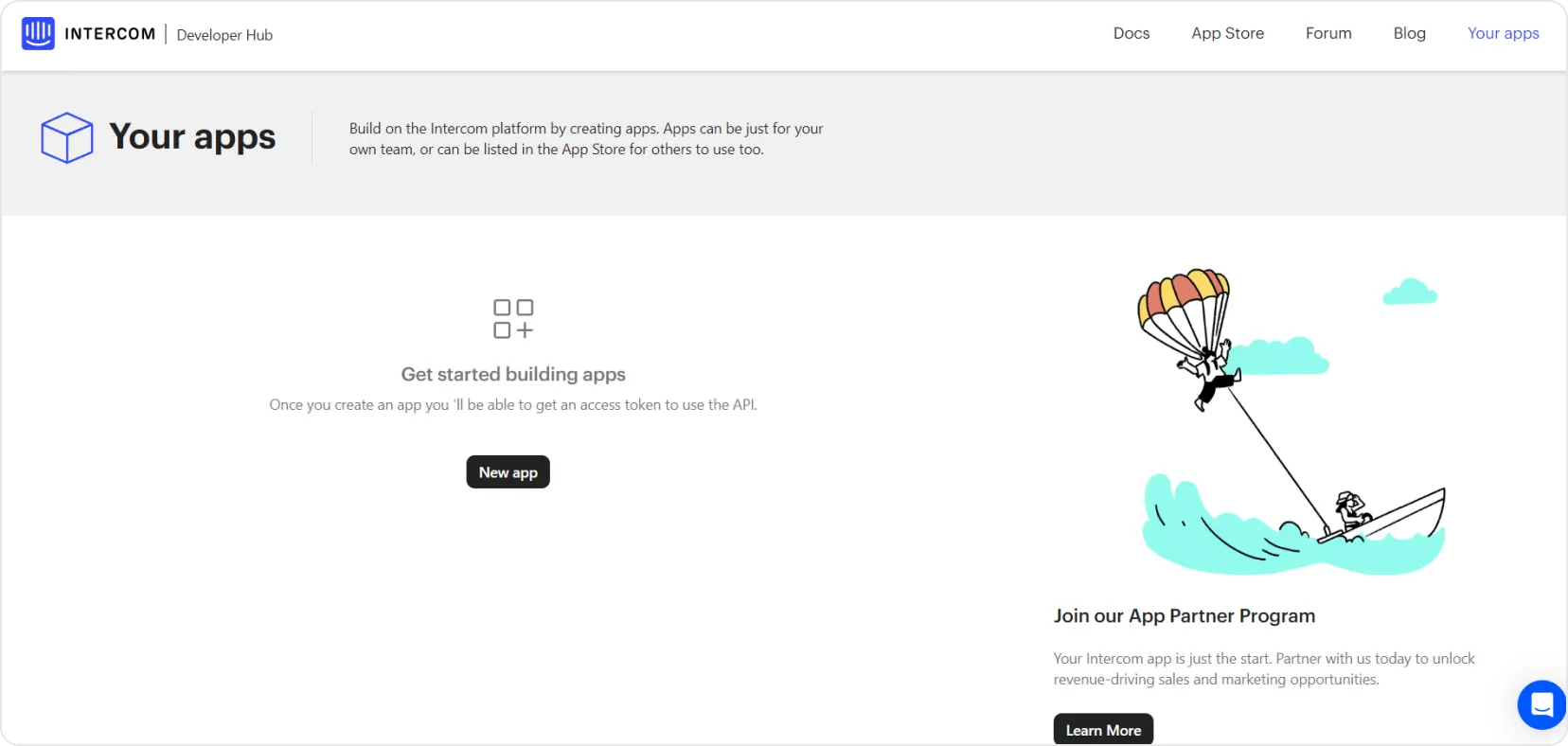 - Create a new app in Intercom by clicking “New app”. If you already have an app, skip this step.