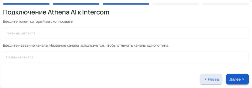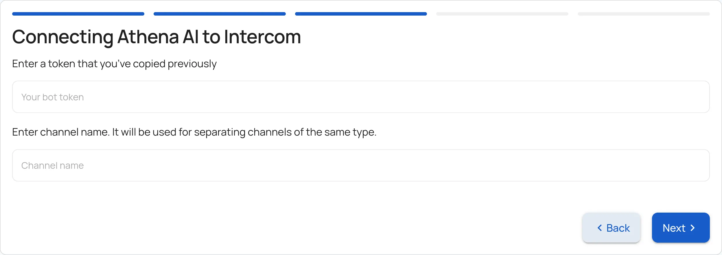 - In Athena, go to the channels section, click “Add channel”, select Intercom, paste the token, and enter the channel name. Then click “Next”.