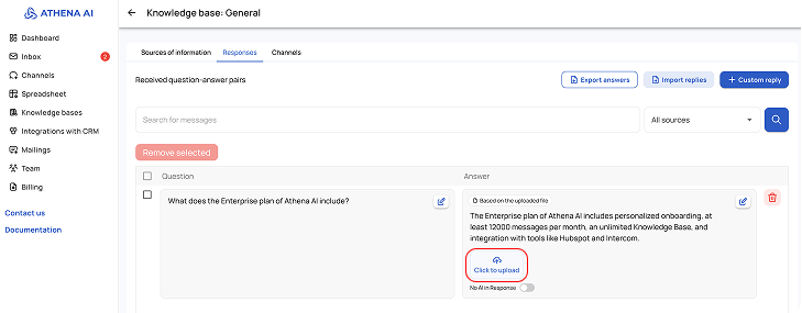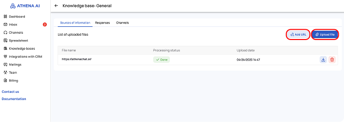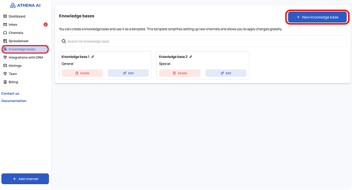 The Knowledge Base is a tool that allows Athena to use the information you provide to answer questions. It is an organized set of data that the AI agent refers to when searching for necessary answers. An effective combination of the knowledge base and AI agent settings ensures the achievement of desired results in the system's operation.