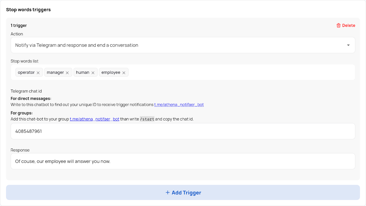 Define a list of stop-words that, when detected, will prompt the bot to perform an action you specify. For example, notify via Telegram, respond, and end the conversation.