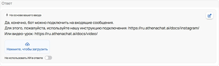If the meaning of the customer's message matches the information in the "question" column, Athena will select the corresponding answer. By default, the answer text may be automatically rephrased by the AI. If you need the answer to be provided exactly as it is specified in the "answer" column, activate the "No AI in Response" toggle.