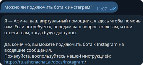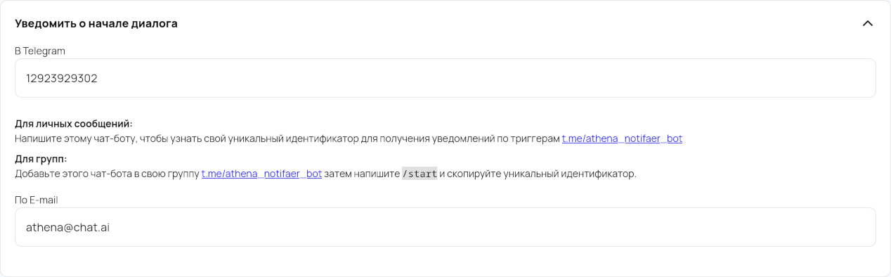 Athena can send notifications not only about a successfully completed task but also about the initiation of a new dialogue. Notifications are supported via Telegram and email.
