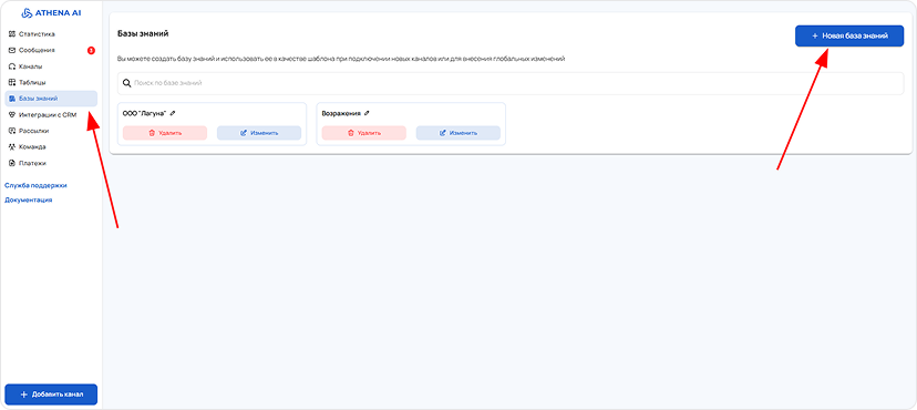 To create a knowledge base, open the corresponding section in the main menu and click the "New Knowledge Base" button. After this, you can proceed to fill it with the necessary information.