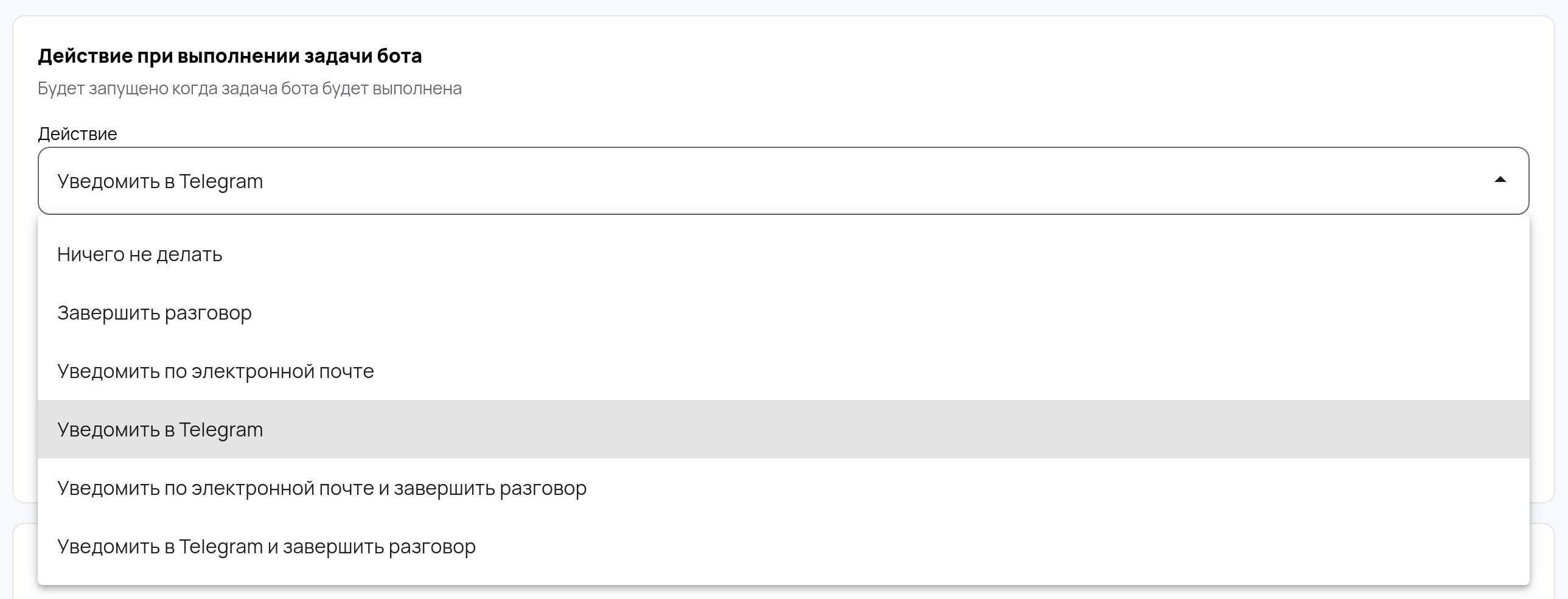 Set up the action that will occur after the bot completes its task. For example, you can choose for the bot to notify you via Telegram or email.