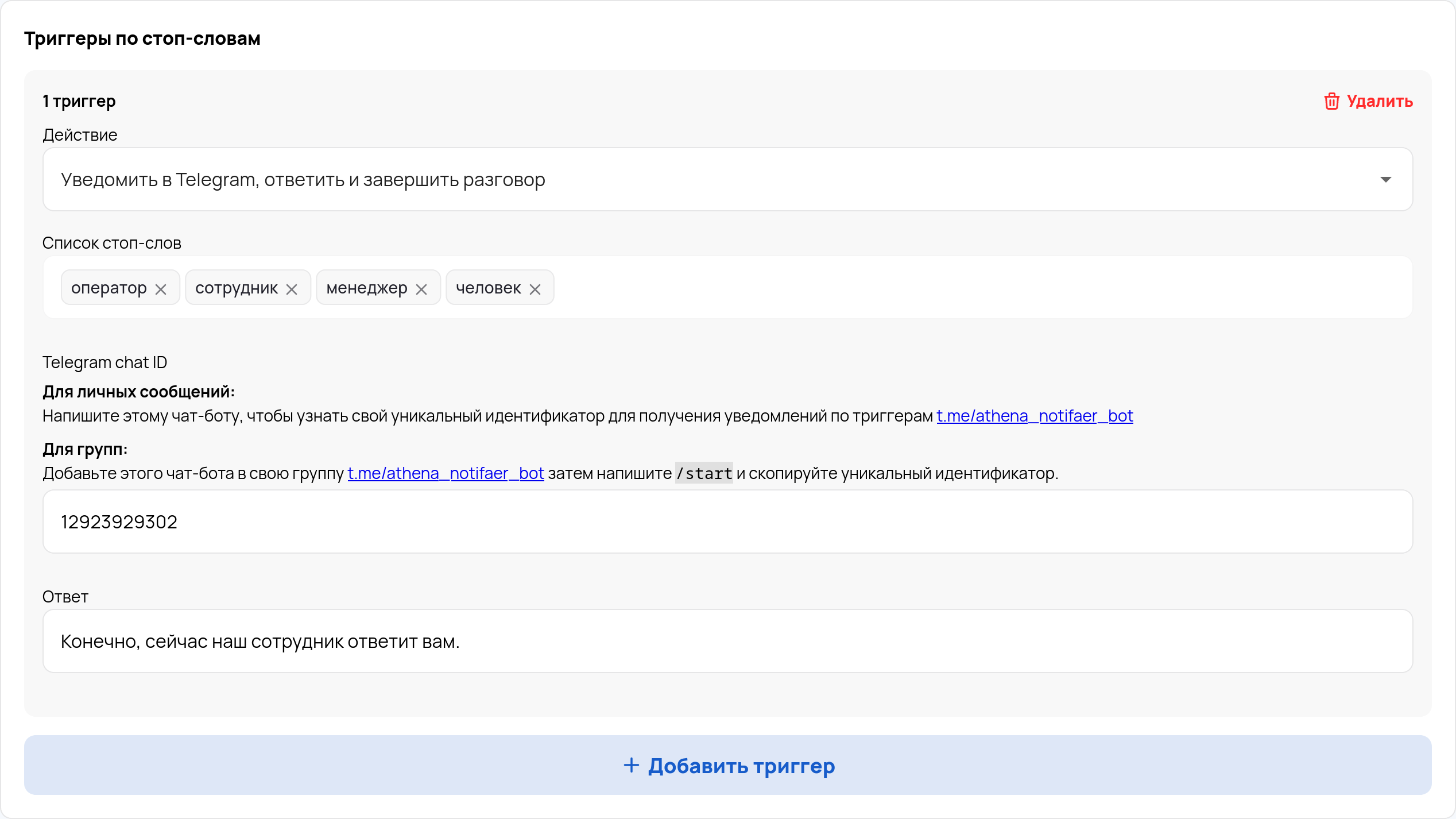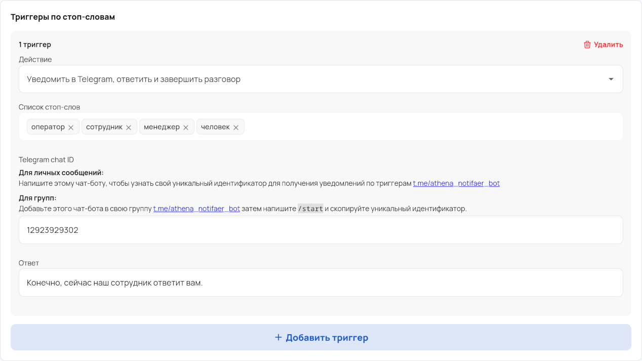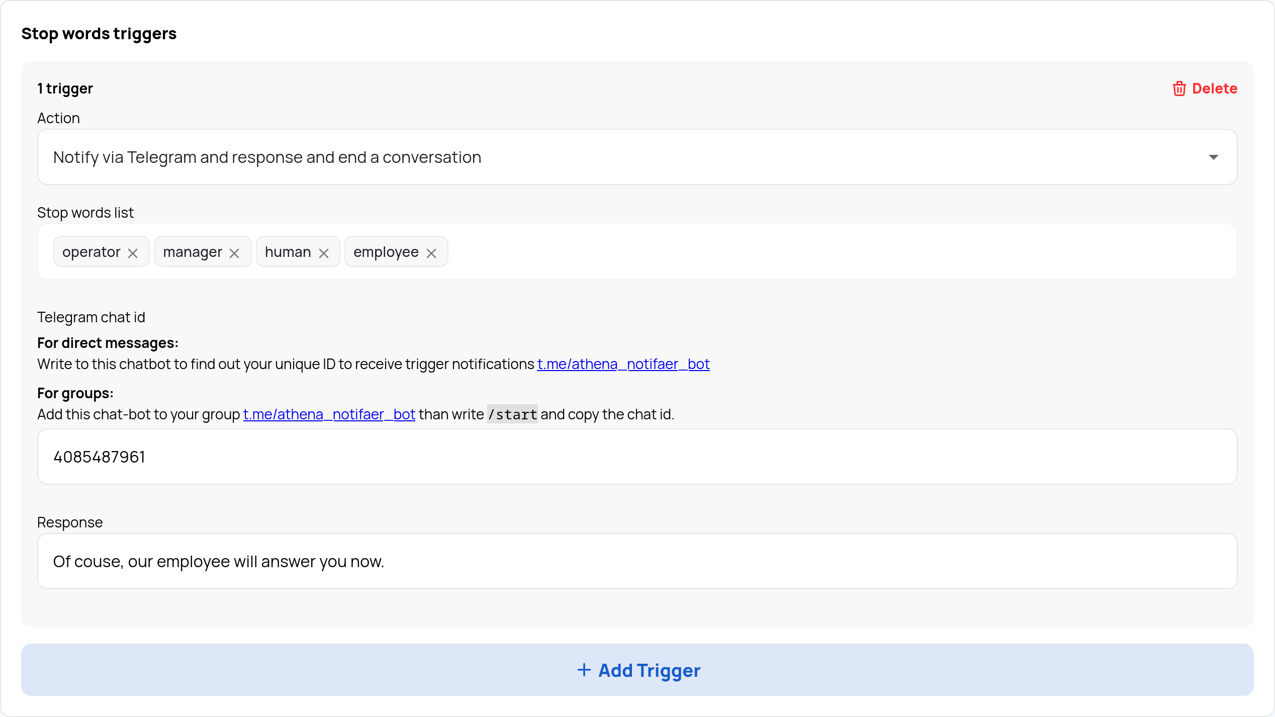 Define a list of stop-words that, when detected, will prompt the bot to perform an action you specify. For example, notify via Telegram, respond, and end the conversation.