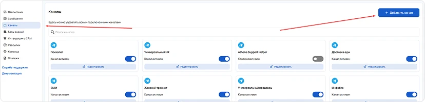 В данном меню вам нужно выбрать все мессенджеры, сайты, где Афина ИИ будет работать на входящей линии. - Выбираем нужную -> Заходим в настройки: