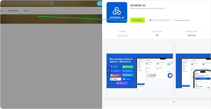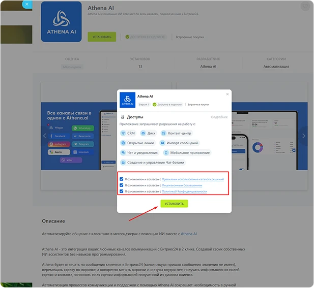 - Готово, открытая линия установлена, и Афина ИИ будет по-умолчанию включаться в разговор в соответствии с настройками.Важно!Чат-бот будет работать только при условии наличия, и создания сделок со стороны Битрикс24.