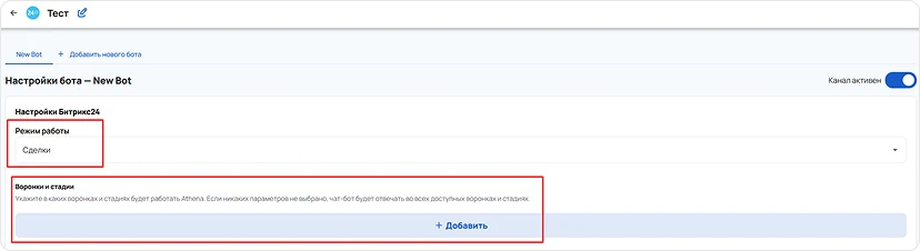 Выберите нужные воронки и стадии, где бот будет работать по умолчанию.