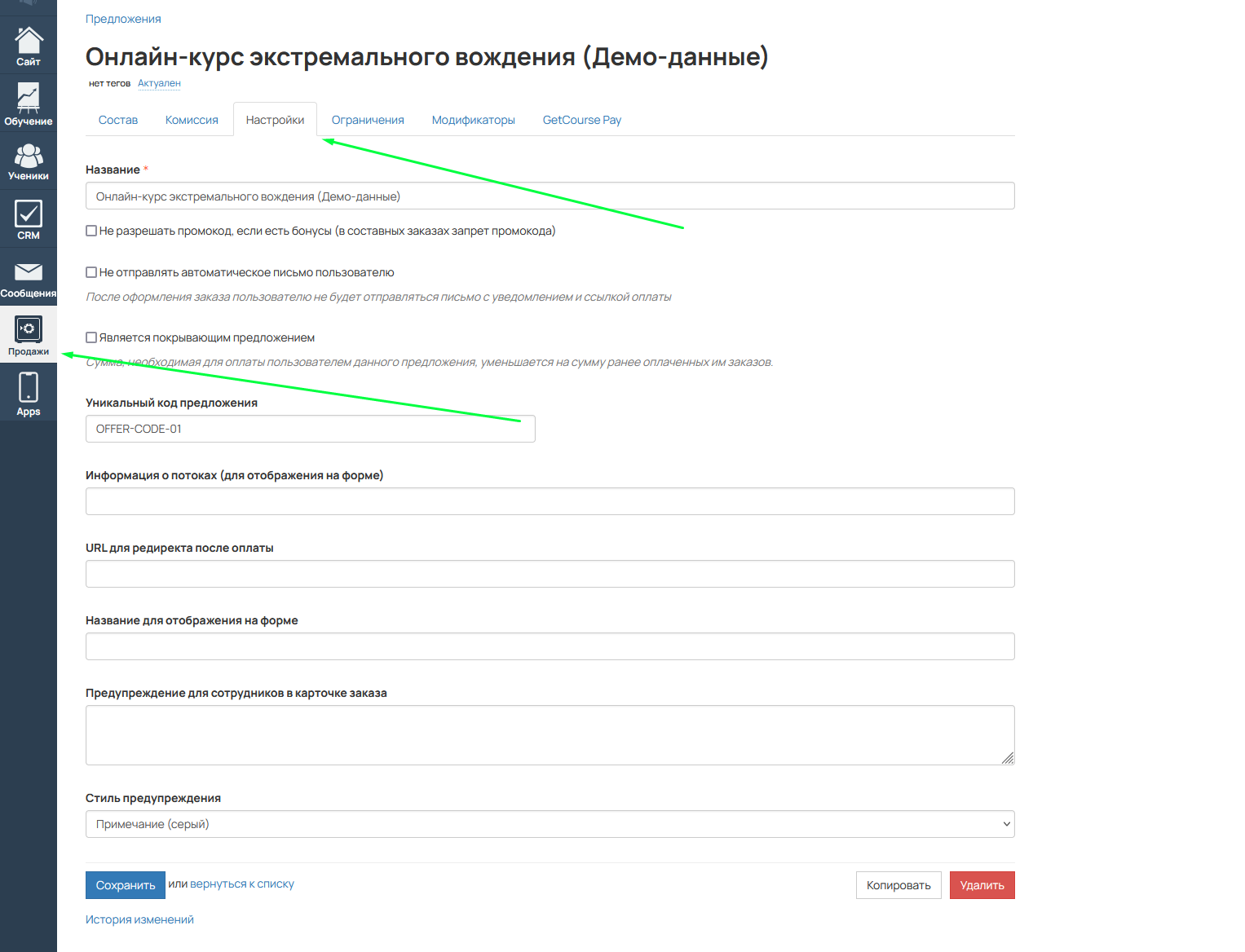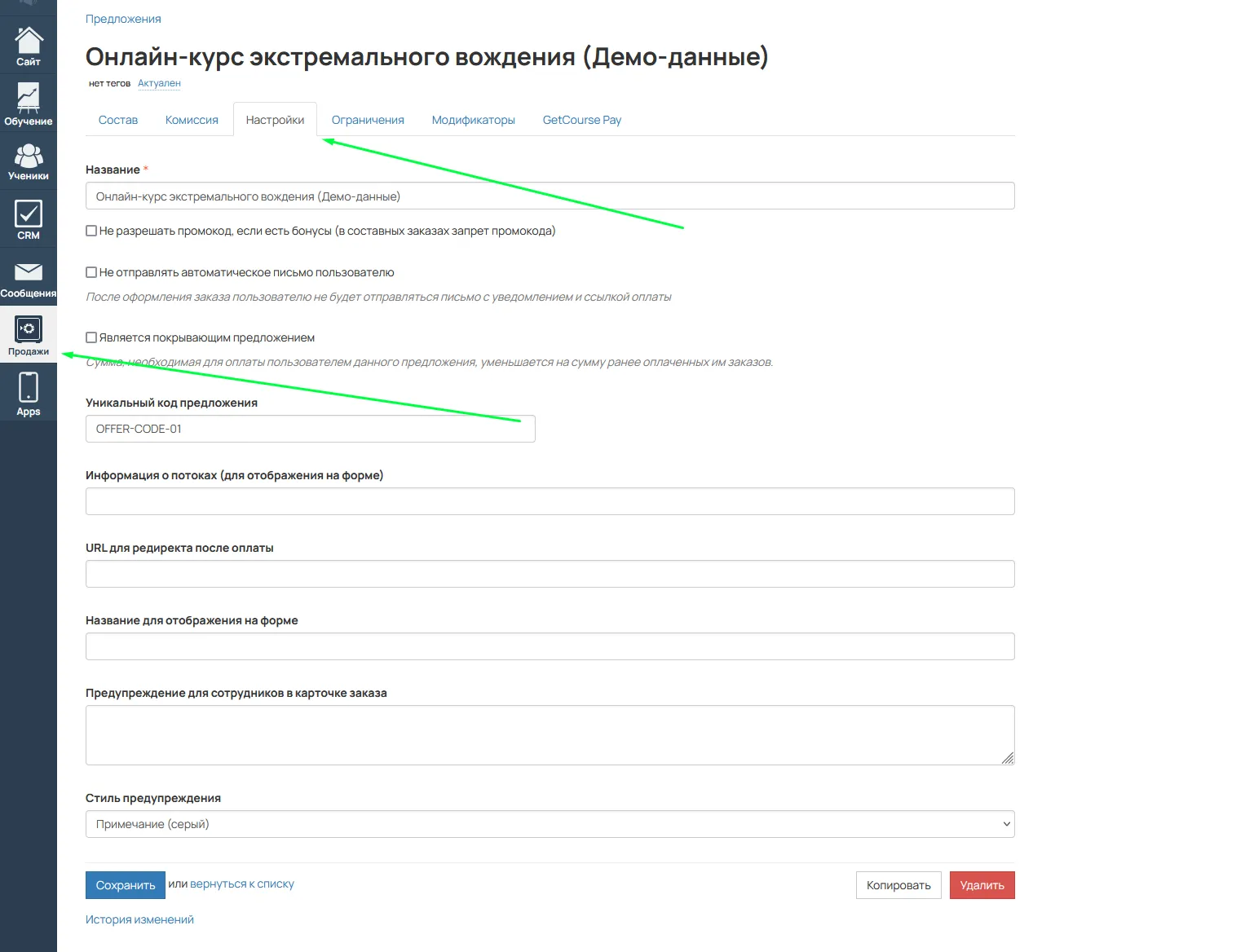 GetCourse -> Продажи -> Настройки -> Скопировать код предложения (уникальный код предложения)