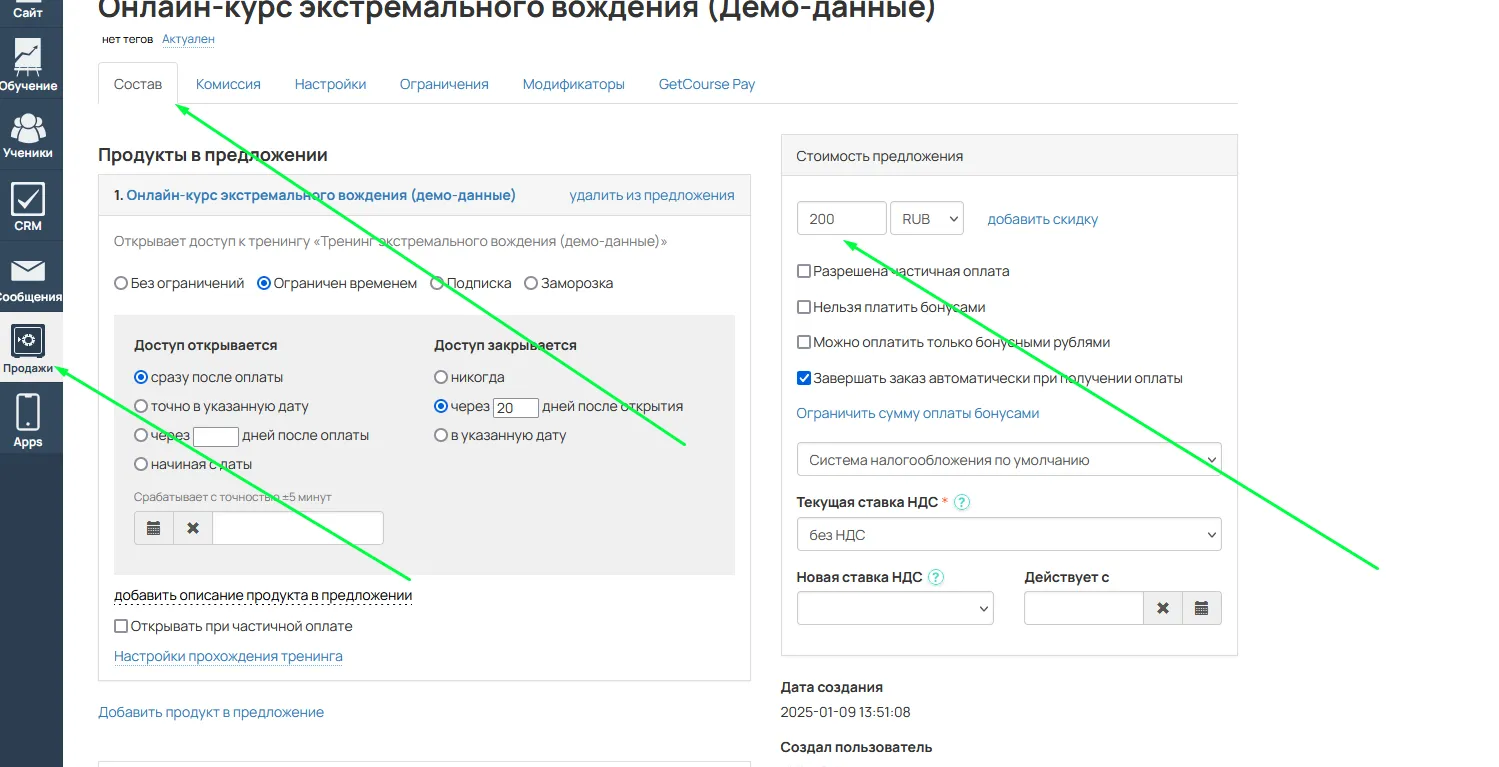 GetCourse -> Продажи -> Настройки -> Состав -> Указать и скопировать цену.