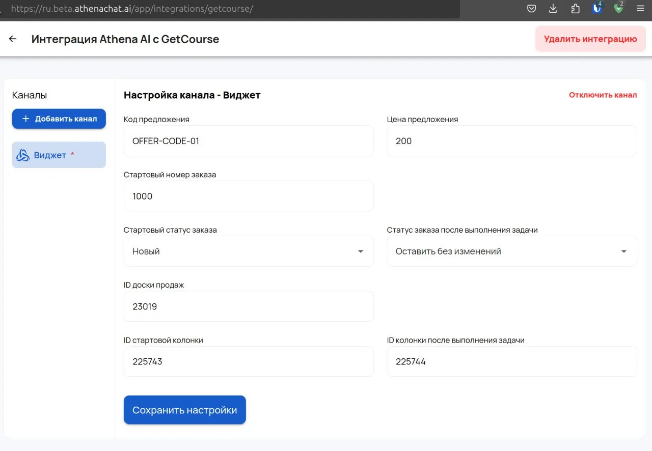 Стартовый номер заказа - начиная с этого номера будут создаваться заказы в GetCourse от имени Афины. Важно, чтобы стартовый номер был большим числом, чтобы новые заказы не пересекались с существующими. (По умолчанию от 1000)